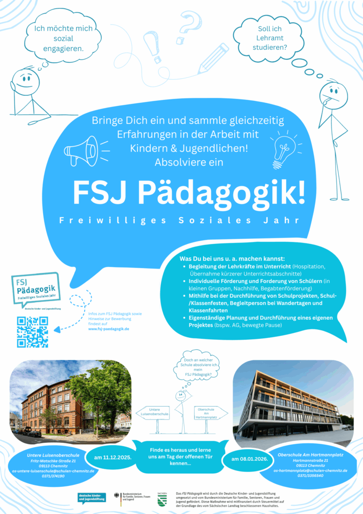 Wenn Sie die benötigten Qualifikationen mitbringen und Interesse an diesem Projekt haben, freuen wir uns auf Ihr Angebot bis zum 22.08.2025! Bitte senden Sie Ihre Unterlagen an os-untere-luisenschule@schulen-chemnitz.de. Postialisch ist die Zusendung ebenfalls möglich.