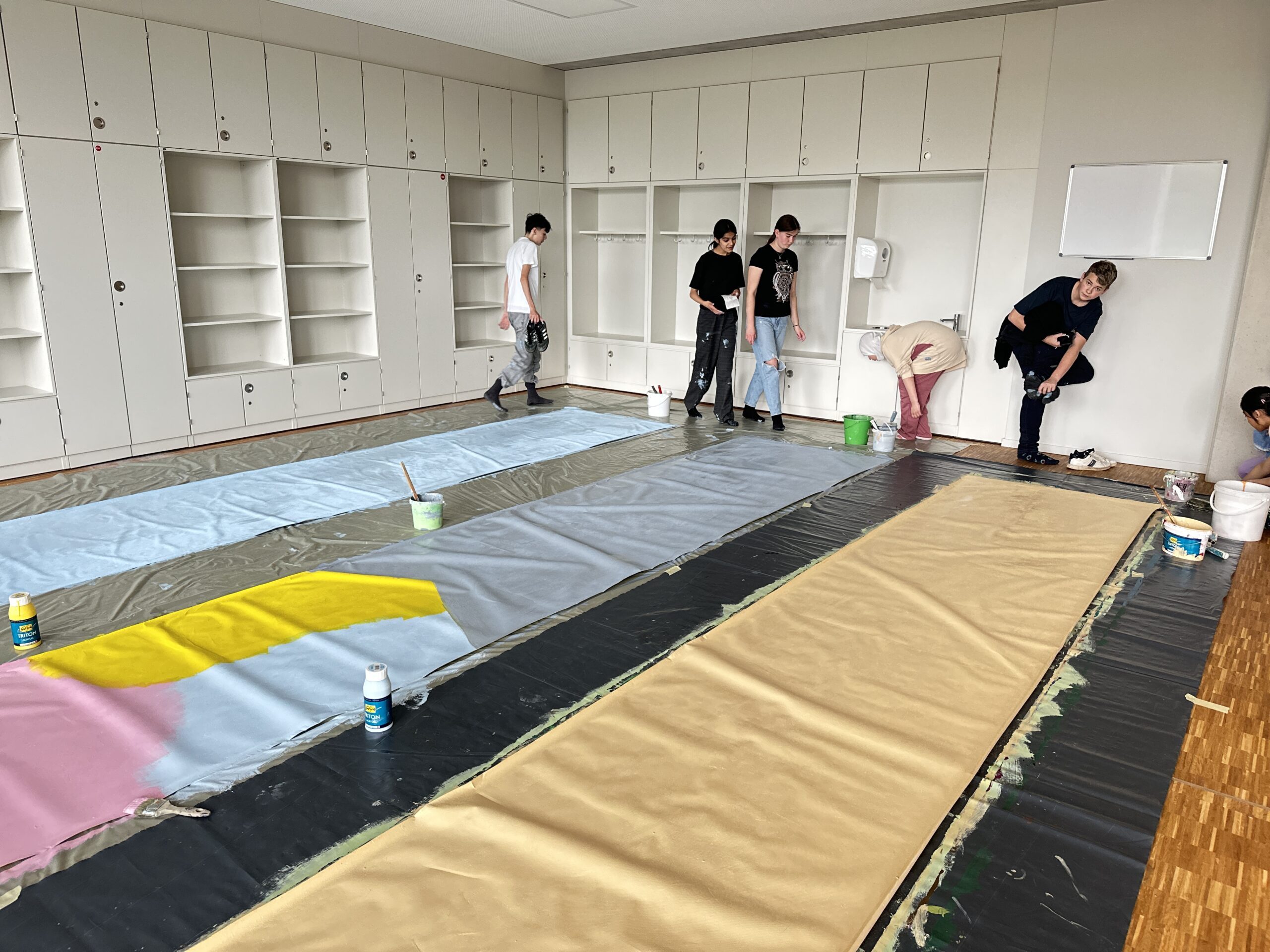 Nachdem jede Gruppe ihren Entwurf gestaltet hatte und die jungen Künstler sich mit leckeren Brötchen und selbstgemachten Kräuteraufstrichen von Herrn Richter gestärkt hatten, ging es ans Grundieren der Banner.